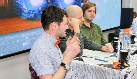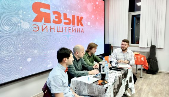 Продолжился вечер обсуждением научных новостей в формате научно-популярного ток-шоу «Язык Энштейна». Кандидат биологических наук, заведующий лабораторией генетики развития ИЦиГ СО РАН Нариман Баттулин, кандидат физико-математических наук, руководитель лаборатории астрономии КЮТ СО РАН, доцент НГПУ, ведущий математик ИТПМ СО РАН Дмитрий Эпштейн и младший научный сотрудник ИСиЭЖ СО РАН Алексей Маслов прокомментировали некоторые события, произошедшие в мире науки в 2021 году.