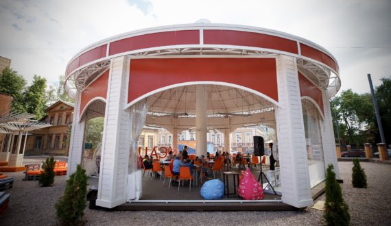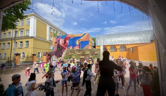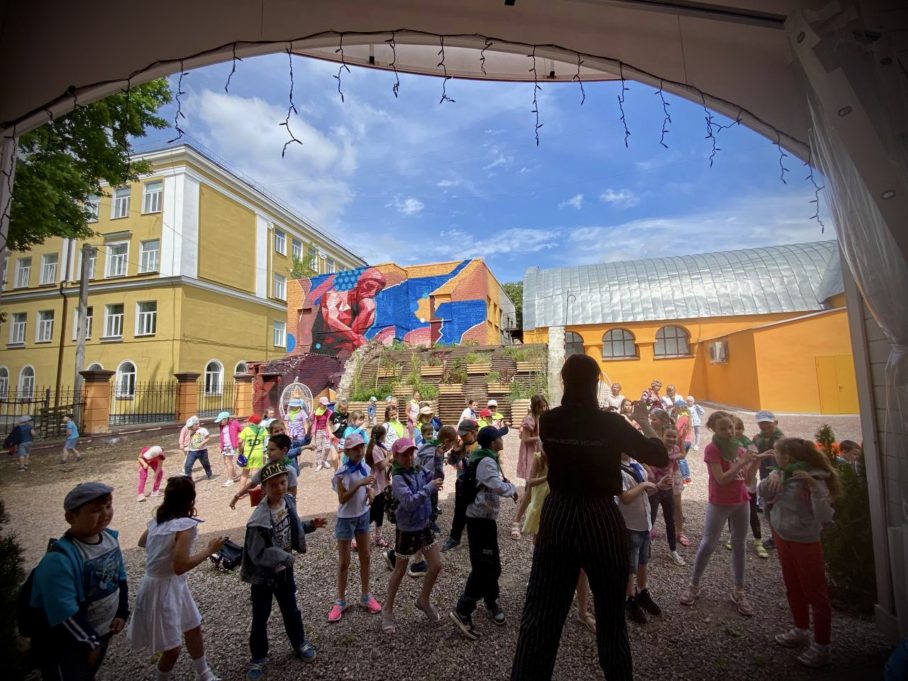 В заключение программы все участники собрались во дворе вокруг ротонды и повторяли движения танцевального флешмоба за сотрудниками центра, а после «атомных» танцев дети отвечали на тематические вопросы викторины при помощи чемоданчика «Детектор знаний».