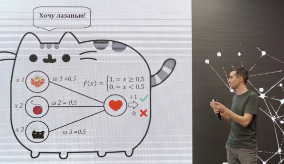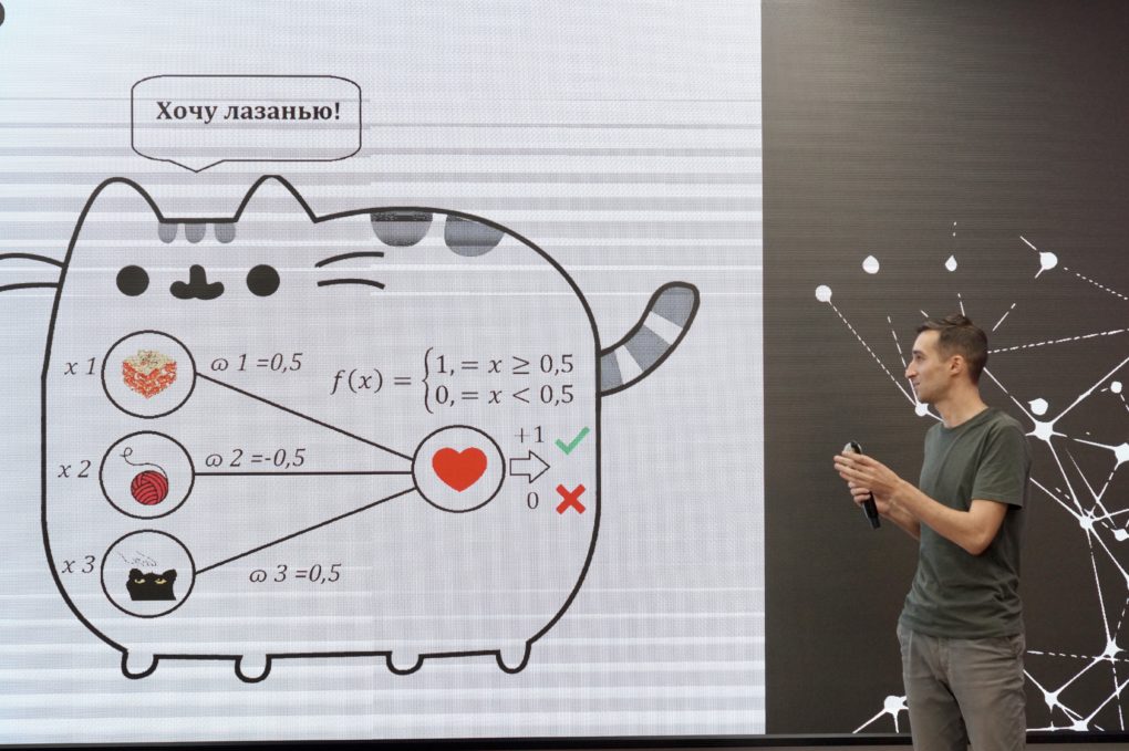 Следующее выступление было посвящено нейросетям. Аспирант ВГТУ Дмитрий Карпухин на простых примерах объяснял принцип их работы: «Нейросеть – это специальный алгоритм, который учит компьютеры обрабатывать данные таким же образом, как и человеческий мозг. Простая вычислительная единица нейросети – это нейрон. Если сумма входных сигналов превышает определённый порог, то нейрон активируется, при активации он выдает входной сигнал, который предается следующему слою нейронов для дальнейшей обработки, если же нейрон остаётся неактивным, его выходной сигнал равен 0».
