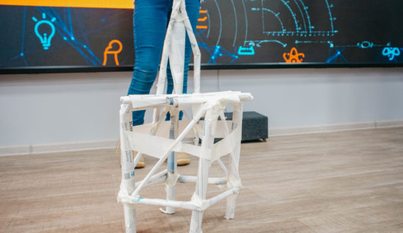 Далее гости смогли проверить свои инженерные способности на мастер-классе по бумажному сопромату. Главной задачей было соорудить прочный и устойчивый стул, который сможет выдержать как можно больший вес. Победителем стала команда «2 карамельки и компот» — их стул из бумаги устоял под весом 145 килограммов.