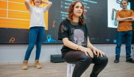 Далее гости смогли проверить свои инженерные способности на мастер-классе по бумажному сопромату. Главной задачей было соорудить прочный и устойчивый стул, который сможет выдержать как можно больший вес. Победителем стала команда «2 карамельки и компот» — их стул из бумаги устоял под весом 145 килограммов.