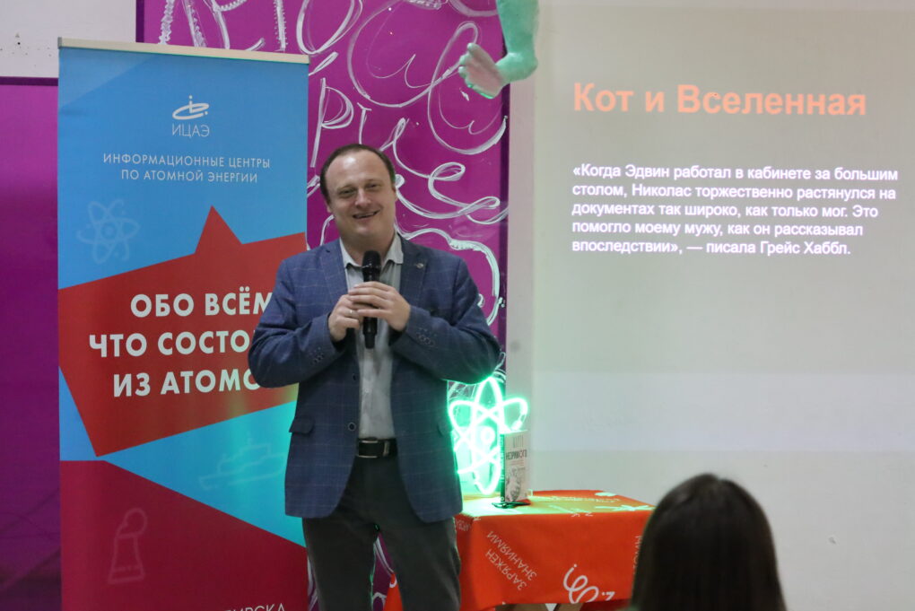 Сразу после мастер-класса началась командная интеллектуальная игра «Красиво атомы сложились», посвящённая котам. Участники отгадывали породы котов, их профессии и научные открытия, совершённые благодаря усатым-полосатым.
