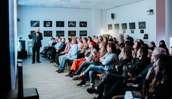 Вечер начался с открытия выставки астрофотографий учащихся школы научного творчества «Фотон». Участники в течение нескольких месяцев учились снимать космические объекты и обрабатывать снимки, совершали ночные выезды за город в охоте за лучшими кадрами, и 12 апреля в ИЦАЭ представили свои работы.