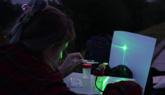 Также член «КрасАстро» Алиса Бутакова наглядно показала зрителям, как можно использовать лазер. «Конечно, мы используем лазерную указку, чтобы показать, о какой звезде на небе идёт речь. Но также мы можем сделать из неё микроскоп», – Алиса показала, что можно направить лазер на лист бумаги, между ними поместить капельку воды, и увидеть, есть ли в ней какие-то бактерии. Так провели опыт с образцами воды из лужи и из-под крана, и увидели, что вторая не имеет в себе движущихся живых организмов, в отличие от первой.