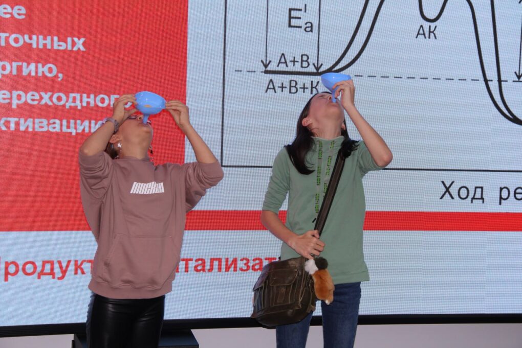 «Катализ – это возбуждение химических реакций или изменение их скорости под влиянием веществ-катализаторов, многократно вступающих в промежуточное химическое взаимодействие с участниками реакции и восстанавливающих после каждого цикла промежуточных взаимодействий свой состав. Именно на катализе основано 90% всей химической промышленности, существуют также вещества — катализаторы, которые изменяют скорость химической реакции, но сами при этом не расходуются. Катализаторы в выхлопной системе автомобиля снижают содержание токсичных веществ в отработавших газах. Основной компонент жевательной резинки – подсластитель сорбит и ксилит также получают с помощью катализаторов», – рассказал спикер.