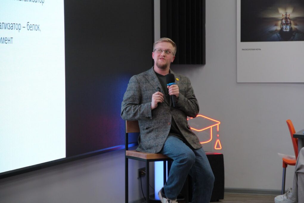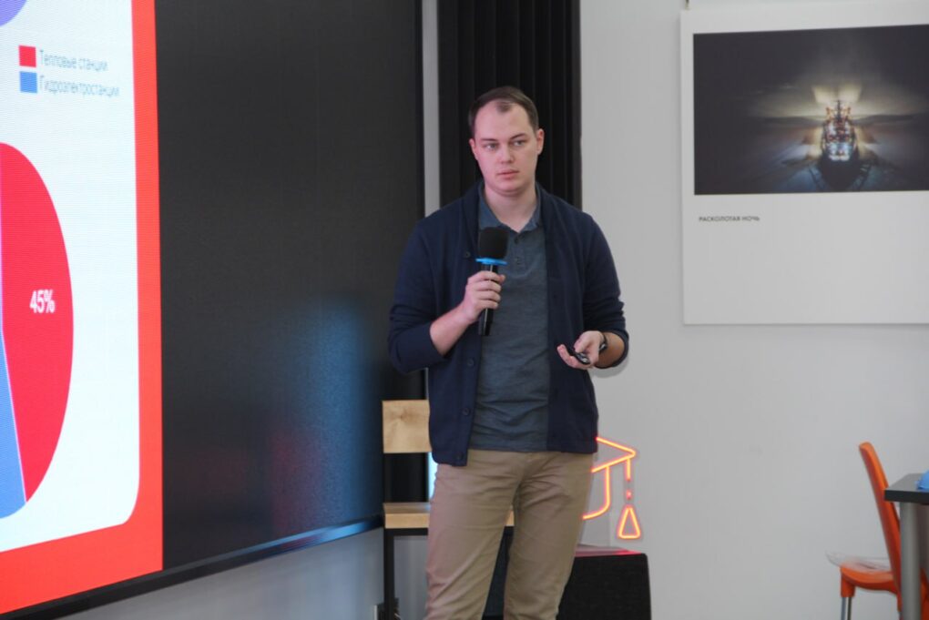 Вечер начался с выступления химика Виктора Голубкова, младшего научного сотрудника лаборатории каталитических превращений возобновляемых ресурсов Института химии и химической технологии СО РАН, заместителя председателя Совета молодых учёных и специалистов при губернаторе Красноярского края.