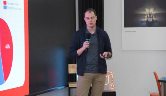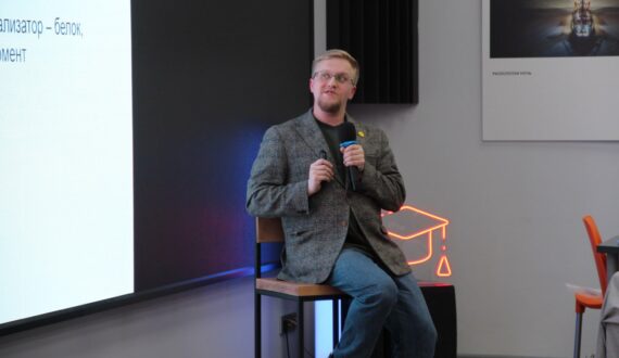 Вечер начался с выступления химика Виктора Голубкова, младшего научного сотрудника лаборатории каталитических превращений возобновляемых ресурсов Института химии и химической технологии СО РАН, заместителя председателя Совета молодых учёных и специалистов при губернаторе Красноярского края.