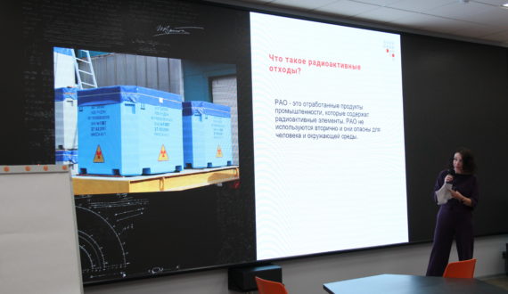 Екатерина начала лекцию с объяснения, что такое РАО: «РАО – это отработанные продукты промышленности, которые содержат радиоактивные элементы. РАО не используются повторно, и они опасны для человека и окружающей среды». Дальше спикеры рассказали, что сейчас возможны способы изоляции радиоактивных отходов на 10 000 лет. И одна из задач, которая стоит перед учёными, – это придумать, как передать информацию о месте изоляции потомкам.