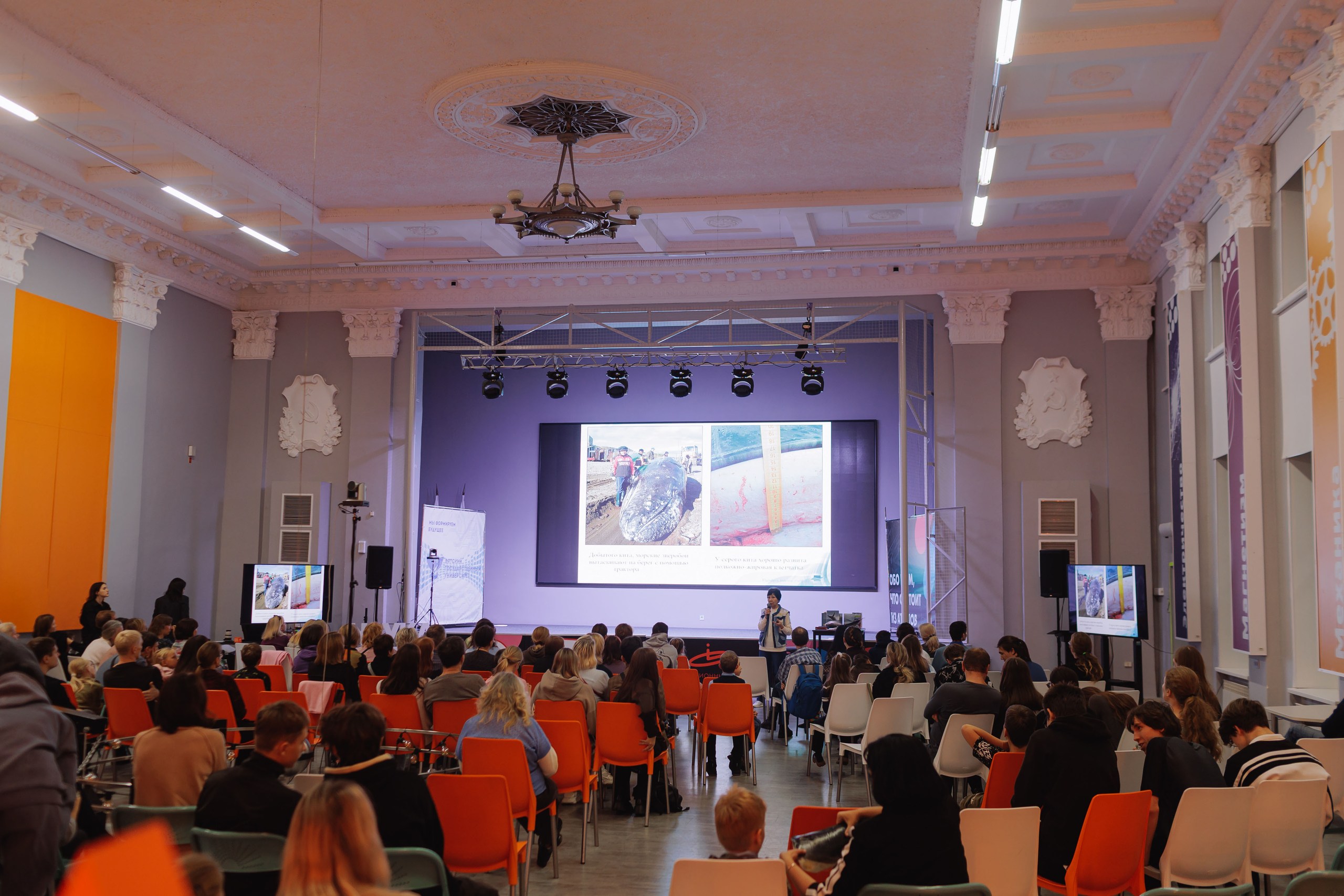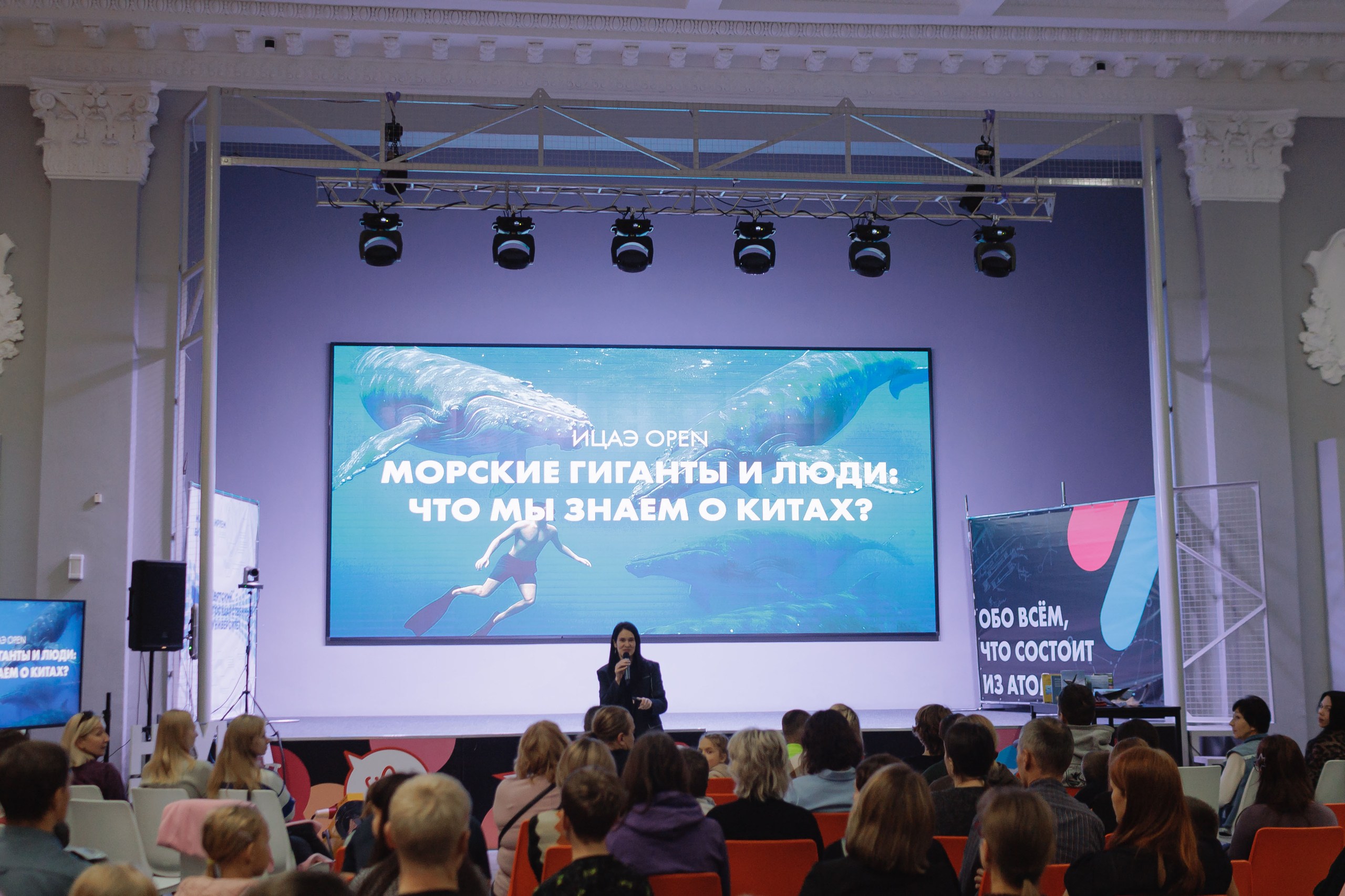 Ещё больше о китах зрители смогли узнать из лекции доктора биологических наук, и.о. заведующей кафедрой охотоведения и биоэкологии ВГАТУ Лидии Букиной. Лидия Александровна ездит в научные экспедиции, встречалась с китами и на Чукотке, и в Канаде, и рассказала гостям о китообразных.