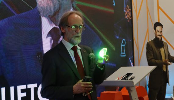 «Изюминкой» лекции стала демонстрация лазеров. Например, кроме лазерной указки, которой можно указывать на звёзды, гости ИЦАЭ своими глазами увидели, как лазер проходит через кусочек материала, и как по цвету излучения можно определить, что материал содержит соли урана.