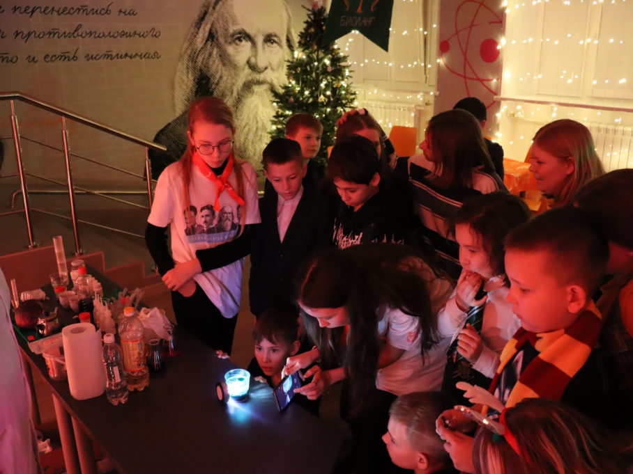 После всех испытаний участники отправились на мастер-класс по химии «Зельеварение», который провела «магистр химии», заведующая лабораторией естественно-научной направленности Центра одарённых детей «ТАУ» Елена Мартынова. Мы все знаем, что сода вступает в бурную реакцию с уксусом, но не всем известно, что соединения, содержащиеся в чае каркаде и отваре краснокочанной капусты также могут вступать в химические реакции, в результате которых образуются яркие, радужные растворы. А еще из веществ, которые есть у всех на кухне, можно сделать «лава-лампу».