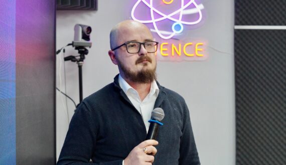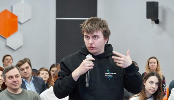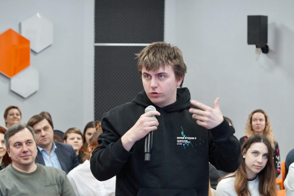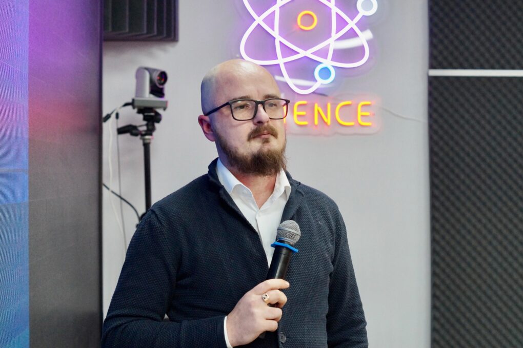 После чего началось ключевое событие вечера ­– ток-шоу «Наука в мемах». Александр Прошунин, младший научный сотрудник на кафедре цифровых технологий Факультета компьютерных наук ВГУ, исследователь в области больших языковых моделей в SberDevices, рассказал о том, как среди ИТ-специалистов себя чувствуют аналитики, что важно знать о машинном обучении и какое будущее ждёт искусственный интеллект.