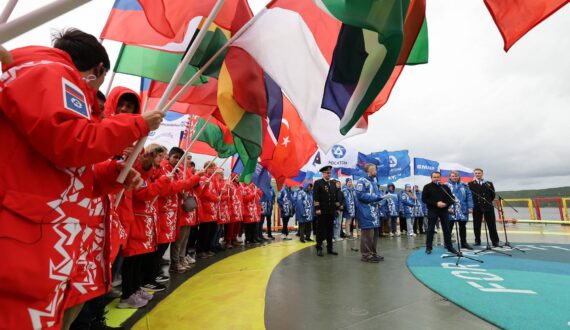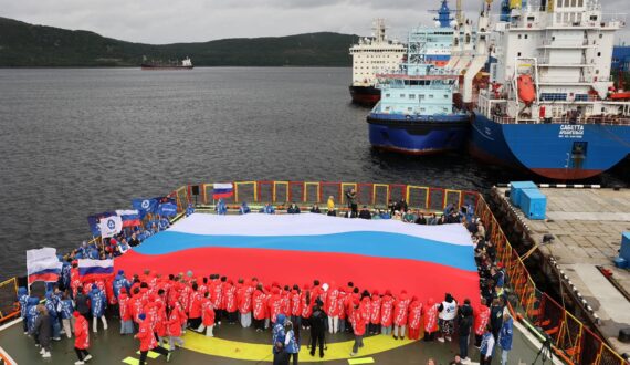 В честь Дня Государственного флага России на церемонии прибытия шестой международной арктической экспедиции «Ледокол знаний» в Мурманск школьники и эксперты из 21 страны развернули на борту атомного ледокола «50 лет Победы» большой российский триколор.