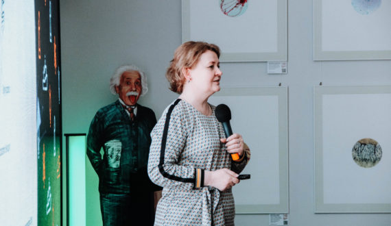Далее гостей вечера ждали две лекции о макро- и микромире. Елена Пожиленкова, кандидат биологических наук, руководитель Центра коллективного пользования «Молекулярные и клеточные технологии» погрузила аудиторию в мир микроскопирования: рассказала о приёмах разрешения малых объектов и способах окрашивания тканей. Эксперт также подробно описала метод флуоресцентной микроскопии, при котором увеличенное изображение получается путём люминесценции возбуждённых атомов и молекул изучаемого образца.
