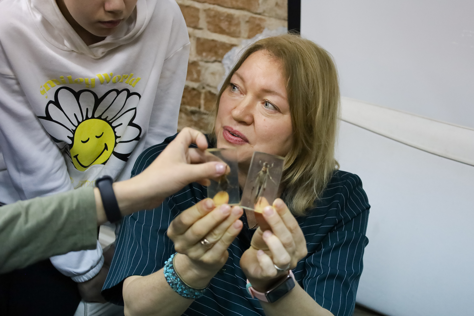 Отдельную часть лекции заняла тема метаморфоза. Гости узнали, как из личинки рождается взрослое насекомое и какие превращения происходят внутри кокона. «Метаморфоз — одно из самых поразительных изобретений природы, — сказала эксперт. — Благодаря ему насекомое может менять не только облик, но и место в экосистеме».
