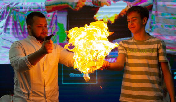 Гости центра не только увидели необычные пиротехнические опыты, такие как «Дирижабль», «Несгораемая купюра», «Горение магния», но и смогли стать их непосредственными участниками. Так, большой интерес вызвал опыт «Горящая рука», который основан на взаимодействии воды, мыла и специального газа. Зрители лично убедились, что при определенных условиях огонь, в прямом смысле, можно держать в руках.