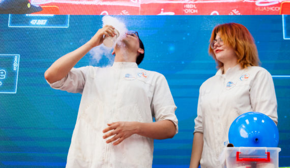 Евгений Недоступ, учащийся магистратуры по специальности «Большие данные и нейросети», и Эвелина Кондратович, учащаяся бакалавриата по специальности «Химические технологии», рассказали и показали участникам шоу, какая температура у жидкого азота, может ли роза разлететься на миллион алых роз, как затушить пламя без огнетушителя и что произойдёт с рукой, если вылить на неё жидкий азот.
