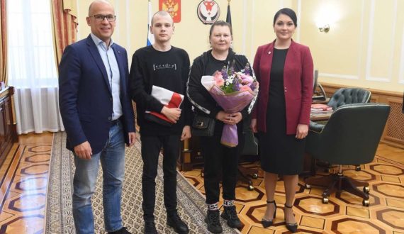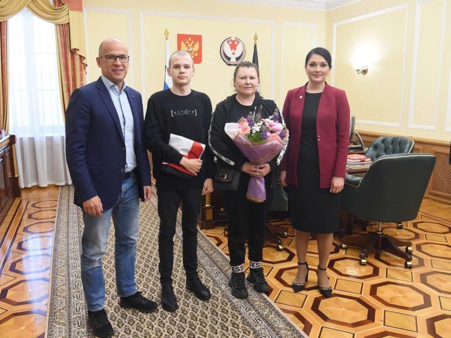 Вручение флага Удмуртии состоялось в присутствии Елены Леонидовны – мамы Вани, которой Александр Владимирович подарил букет цветов и поблагодарил за смелость отпустить сына на научную экспедицию.