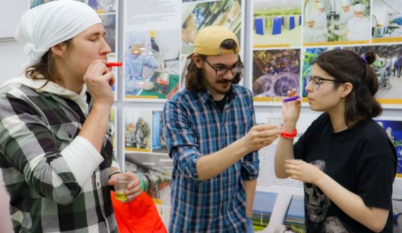 В завершении вечера гости ИЦАЭ тоже смогли посоревноваться в создании самого большого мыльного пузыря, перед этим изучив разные составы мыльных растворов и сравнив составы и свойства самодельных и покупных растворов для выдувания пузырей. В частности, они узнали, что прочность мыльным пузырям придают сахар и аптечный глицерин и что гигантские шары выдувают медленно и из широкого отверстия, а маленькие – из соломинки.
