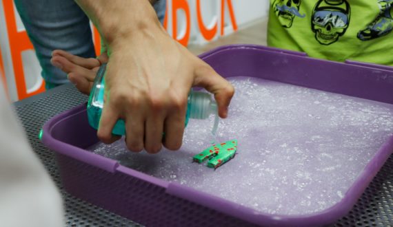 В завершении вечера гости ИЦАЭ тоже смогли посоревноваться в создании самого большого мыльного пузыря, перед этим изучив разные составы мыльных растворов и сравнив составы и свойства самодельных и покупных растворов для выдувания пузырей. В частности, они узнали, что прочность мыльным пузырям придают сахар и аптечный глицерин и что гигантские шары выдувают медленно и из широкого отверстия, а маленькие – из соломинки.