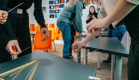 Первым делом спикер попросил участников рассказать какие же роли при работе в команде они знают и в каких уже были сами. Затем, после разбивки на команды и знакомства в них, прошла инженерно-конструкторская игра, задача которой состояла в постройке моста из макарон и малярного скотча от одного стола к другому.