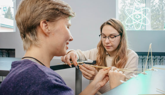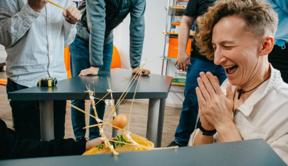 Всю стратегию и вид конструкции команды разрабатывали сами, распределяя роли и ответственность. Под конец заданного времени была дана новая вводная – создать платформу, которая выдержит яйцо. Этим самым проверялось умение встраивать новые задачи в процесс и грамотно распределять ресурсы команды.