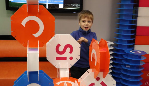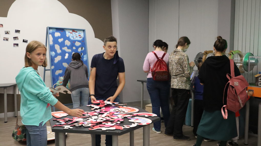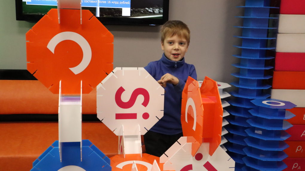 Начался ИЦАЭ OPEN с «Научной гостиной»: посетители играли в настольные игры, собирали большой паззл в форме стилизованного атома, строили соединения из «Молекулярного конструктора» и всё это – под детское научно-популярное шоу «Что и требовалось доказать».