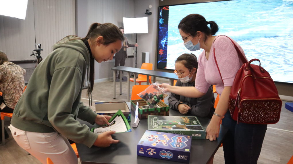 Начался ИЦАЭ OPEN с «Научной гостиной»: посетители играли в настольные игры, собирали большой паззл в форме стилизованного атома, строили соединения из «Молекулярного конструктора» и всё это – под детское научно-популярное шоу «Что и требовалось доказать».