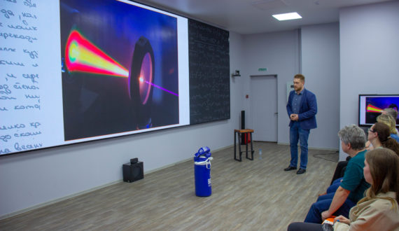 Атон Осипов объяснил, как возникает лазерный луч. Оказалось, что в первых лазерах использовали рубины, поскольку их состав позволяет создать и усилить световой импульс. «Монохромность и когерентность – две базовых характеристики лазерного луча. Рубин – это сапфир (оксид алюминия) с ионами хрома. Фотоны света (источник накачки), воздействуя на ионы хрома, переводят их в возбуждённое состояние, и их электроны переходят на другой энергетический уровень, а затем возвращаются обратно с выделением энергии в виде световой волны. Когерентность – это согласованность: все атомы синхронно излучают одинаковые фотоны», — рассказал Антон. Научно-популярное ток-шоу «Физики и лирики» впервые прошло во Владимире в сентябре 2021 года на фестивале науки «КСТАТИ».