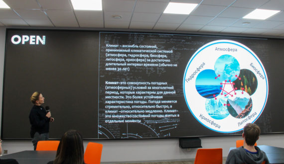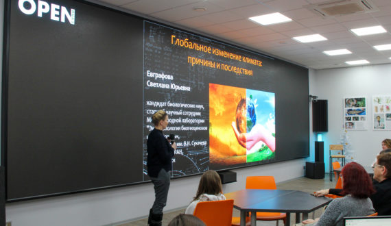 После показа выступила кандидат биологических наук, старший научный сотрудник Института леса им. В.Н. Сукачева СО РАН, участница экспедиций в Арктику и Антарктиду Светлана Евграфова. «Глобальное потепление – это общее повышение температуры на Земле, вызываемое скоплением в атмосфере парниковых газов, которые удерживают тепло у поверхности Земли. Это процесс постепенного роста средней годовой температуры поверхностного слоя атмосферы Земли и Мирового океана вследствие всевозможных причин. Потепление – это часть естественного цикла развития Земли, но человечество в связи с индустриализацией стало существенно влиять на этот процесс, ускорять его. Последствием этого процесса может стать таяние вечной мерзлоты, а значит, разрушение основания многих городов, расположенных на Севере, а также повышение уровня океана, и затопление прибрежных городов», – объяснила Светлана.