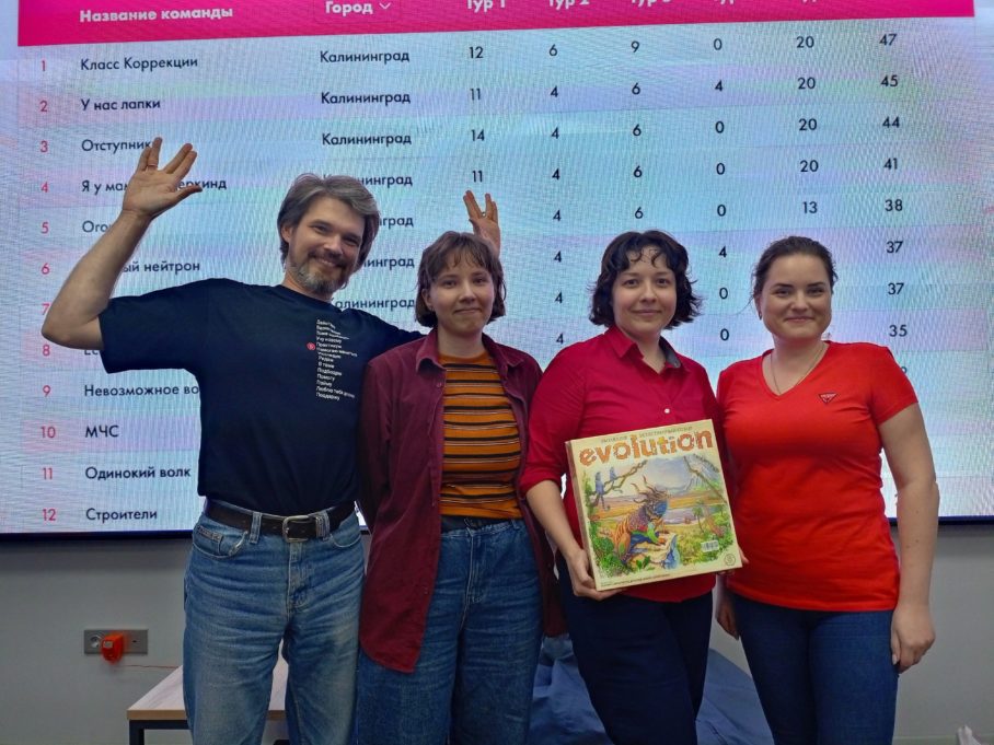 Лучший результат показала команда «Дети Клио» из Кирова, набрав 52 балла. На втором месте оказалась команда «Собрались» из Саратова, которая заработала 49 баллов. Их капитан Марина Колядина поделилась: «Мы очень напряглись после первого тура, потому что забыли вопрос и перепутали ответы. А в туре с хронографом было обидно, что чуть-чуть не угадали с датой, хотя сама игра от сети ИЦАЭ у нас есть, и дома мы играем в нее. А тут запутались! В целом, по сложности вопросы были в одном диапазоне, и это хорошо: игра прошла без „эмоциональных качелей“». В Калининграде лучшей стала команда «Класс Коррекции» с результатом в 47 баллов.