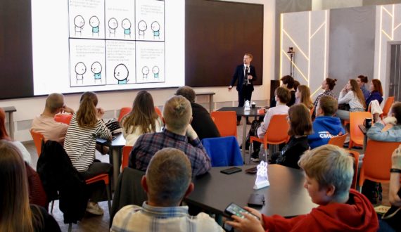 Следующим выступил Евгений Ратц, инженер 1 категории отдела организации строительства АО «Атомэнергопроект». Свой рассказ Евгений начал с того, что его работа – это проектирование строительства атомных электростанций. Он и его коллеги определяют, с помощью какой техники будет происходить строительство, в каком порядке, что необходимо учесть и как должен происходить процесс. В форме юмористических картинок спикер рассказал о важности чёткого технического задания, о том, чем отличаются архитекторы от инженеров-проектировщиков, и какие ошибки можно допустить при создании чертежей. Например, одними из самых распространённых ошибок являются игнорирование отметок пола и недостаток эвакуационных выходов.