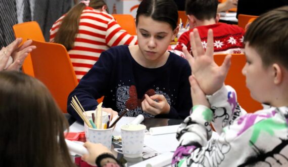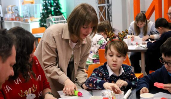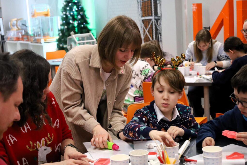 Вторым событием вечера стал мастер-класс по лепке ёлочных игрушек из полимерной глины, который провела учитель Гимназии № 1 Евгения Докторова. Участники создавали новогодние украшения в виде атомов, химических колб и полярных медведей, и заодно разбирались, что представляет собой полимерная глина, за счёт чего она затвердевает и где применяются полимерные материалы — от повседневных изделий до изоляционных и конструкционных элементов в энергетике.