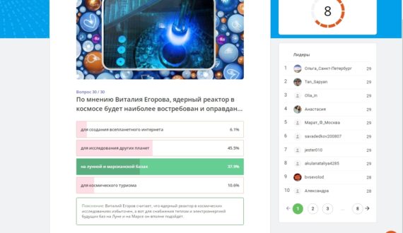 Ядерный реактор в космосе будет в большей степени востребован на будущих лунных и марсианских базах – именно так считает космический блогер Виталий Егоров, а его ник – это Zelenyikot. Просмотр «Science sound» помог участникам правильно ответить на эти и другие вопросы.