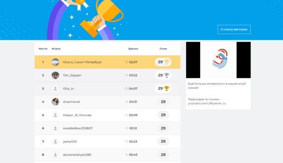 Одинаковый максимальный результат – 29 баллов – набрали сразу три человека, две Ольги и Татьяна, но Ольга Колмогорова из Санкт-Петербурга заработала свои баллы за рекордное время 2 минуты 37 секунд, благодаря чему и была признана победительницей квиза и обладательницей приза – умного браслета.