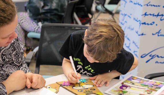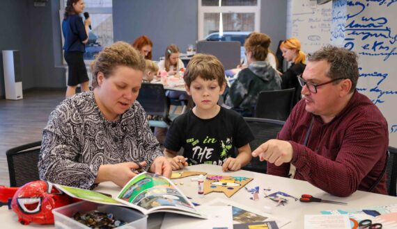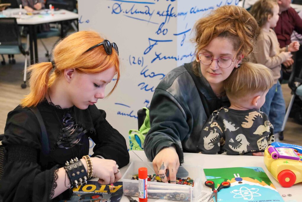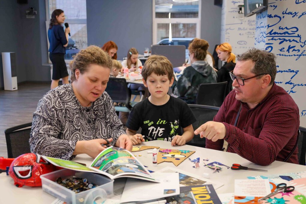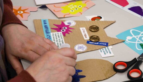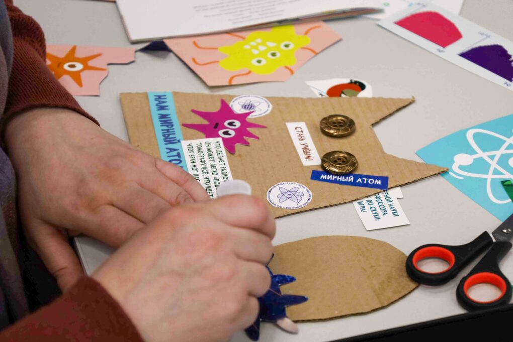 Завершился вечер творческим мастер-классом «Атомная открытка» под руководством волонтёра проекта «Банк вещей» Галины Будавас. Используя технику апсайклинга, дети и родители превращали старые журналы и комиксы в новые изделия. Участники вырезали открытки в форме котов – символов домашнего уюта. На готовые силуэты гости наклеивали слова, вырезанные из прессы. Чаще всего на «атомных открытках» появлялись слова, отражающие суть встреч в ИЦАЭ: «наука», «атомная энергетика» и «семья».