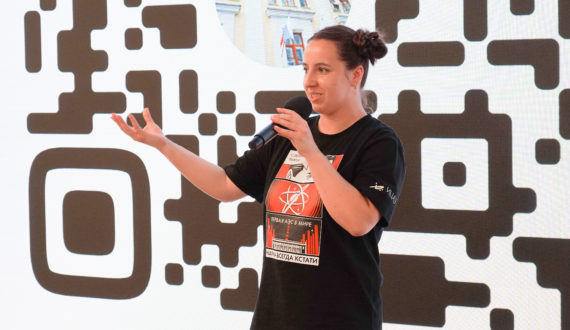 Следующей выступала Олеся Азарёнок — специалист группы сопровождения Отраслевого мемориального комплекса Первой в мире АЭС, АО «ГНЦ РФ – ФЭИ». С помощью мемов и знания истории Олеся буквально «провела экскурсию», рассказав про специфику работы сотрудников Обнинской АЭС.