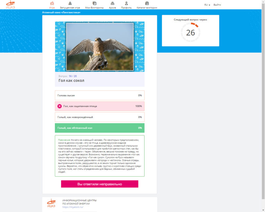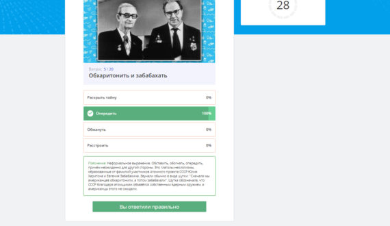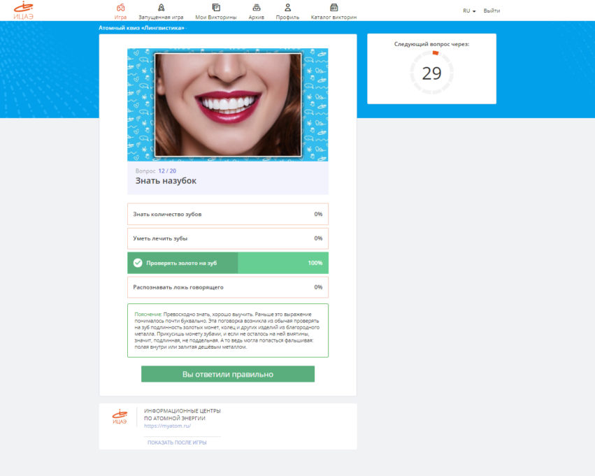 «Очень рад, что тематические атомные квизы вернулись. Понравились вопросы, связанные с «атомной» лексикой – про Харитона и Забахина, тюбетейку» и жёлтый пирог. Другие фразеологизмы и устойчивые выражения оказались более-менее мне знакомы, но не все в их исконном значении. Отдельное спасибо организаторам за комментарии – читал с удовольствием», – поделился впечатлениями Денис Горшков.