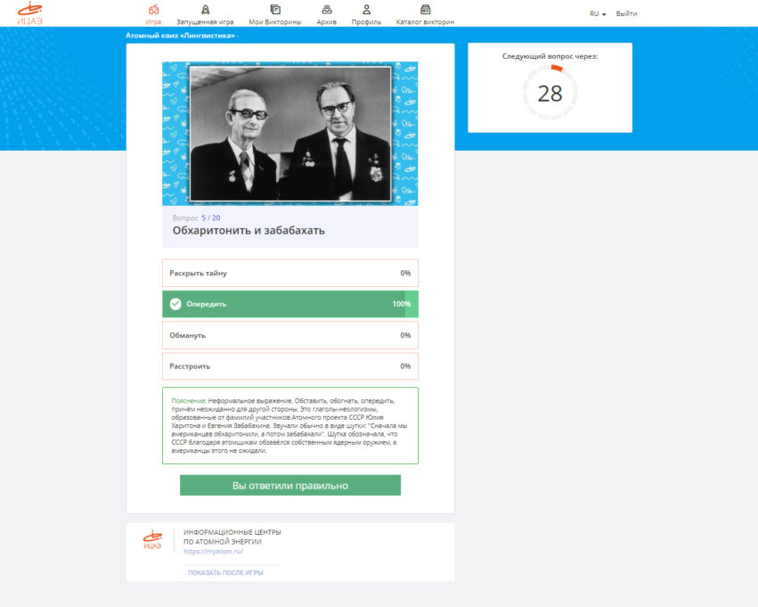Также игроки проверили, насколько им знакома «атомная» лексика, богатая интересными устойчивыми словосочетаниями. Так, к примеру, в атомной отрасли «жёлтый кек» – Это закись-окись урана, которая выглядит как порошок ярко-жёлтого, а иногда бурого цвета.