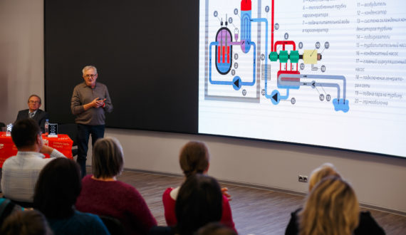 О роли воды в ядерном реакторе на атомной электростанции и о том, как вода становится радиоактивной, рассказал Виктор Дашкевич, кандидат химических наук, заведующий лабораторией гидробиологии и гидрохимии. «Есть два основных назначения воды для реакторов типа ВВЭР – это теплообмен и охлаждение, — подчеркнул спикер. — Важно отметить, что вода из первого контура никак не контактирует с водой второго контура, что положительно сказывается на безопасной эксплуатации АЭС и делает невозможным радиоактивное загрязнение воды, сбрасываемой в конечный поглотитель».