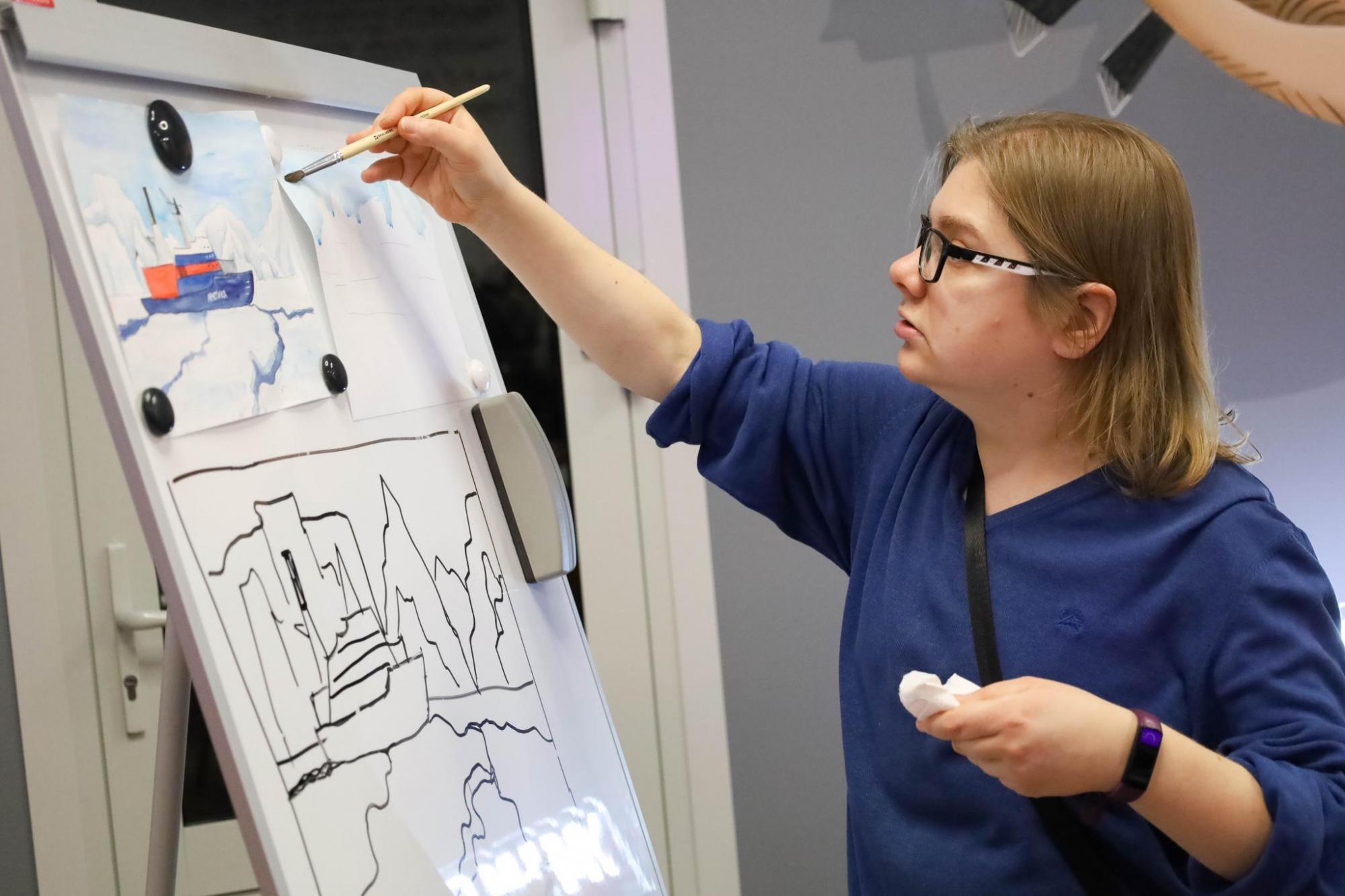 «Арктика кажется суровой, но в акварели она раскрывается удивительно мягко. Здесь важны тон, глубина и чувство пространства», — отметила Арина Чекушкина, демонстрируя, как работать с холодной палитрой.