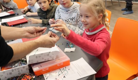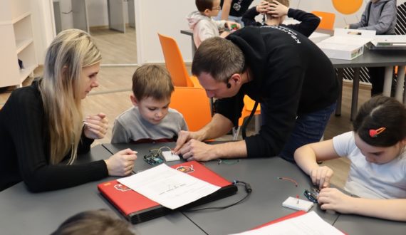 Второй мастер-класс был посвящён знакомству с альтернативными источниками энергии. Наставником стала Жанна Синицына – наставник «Энерджи Квантума», педагог дополнительного образования ДТ «Кванториум». Родители и дети узнали о солнечных батареях, ветрогенераторах, познакомились с параллельными и последовательными схемами. Самому младшему участнику было, всего 6 лет, а самому старшему 13. « Мне очень понравился мастер-класс. Я теперь хочу домой себе такой же конструктор, чтобы собирать свои идеи. А ещё мы узнали, что и в конструкторе, и в роботе-пылесосе одинаковая микросхема. Прямо как мини-компьютер. Если робот-пылесос сломается, его можно перепрограммировать», — поделилась своими впечатлениями маленькая Ярина.