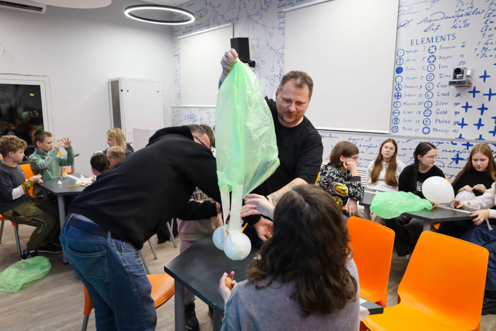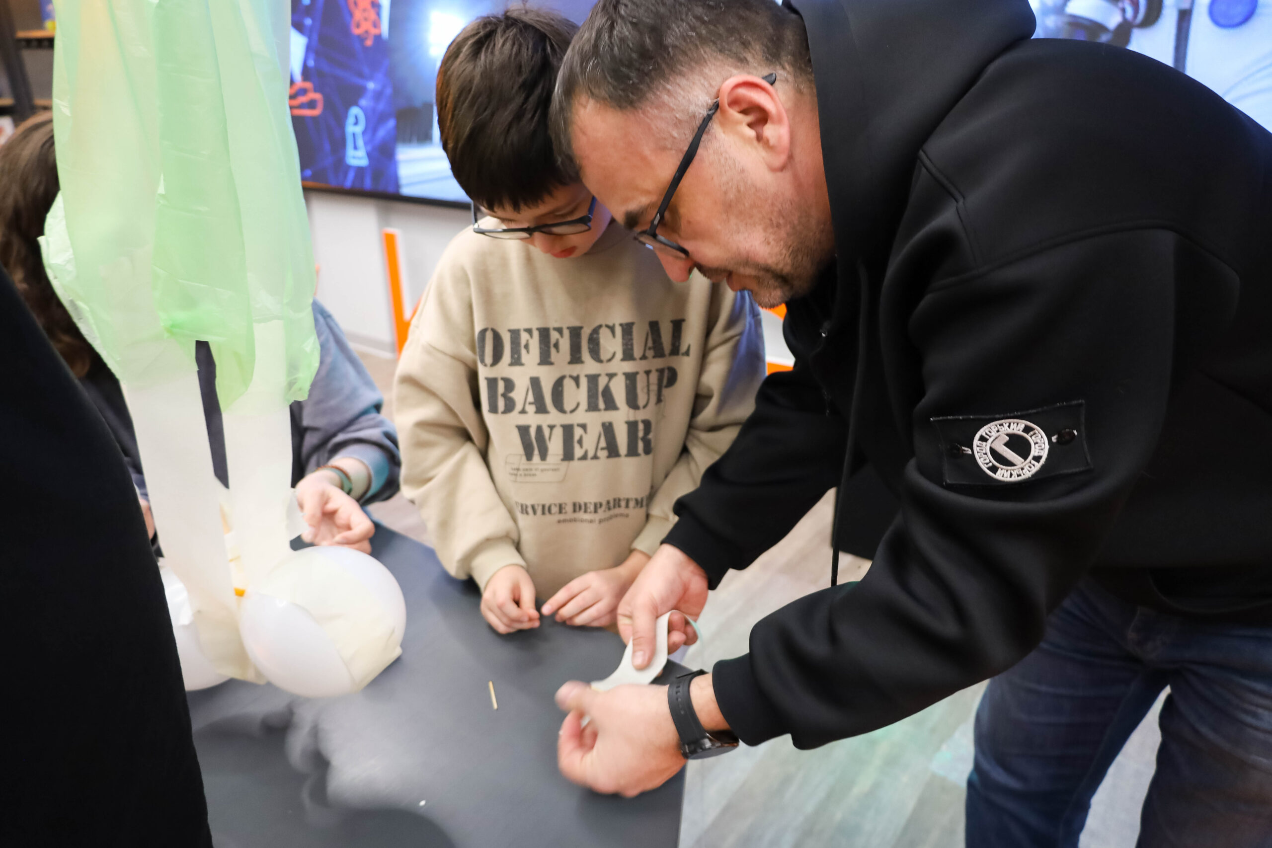 Вечер начался с мастер-класса «Ракета для цыплёнка». Участникам необходимо было решить задачу, знакомую каждому ракетостроителю: создать конструкцию, которая обеспечит мягкое приземление космонавту. В роли космонавта выступал невылупившийся цыплёнок — символический пассажир, судьба которого полностью зависела от прочности конструкции летательного аппарата.