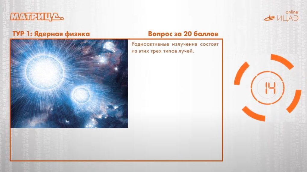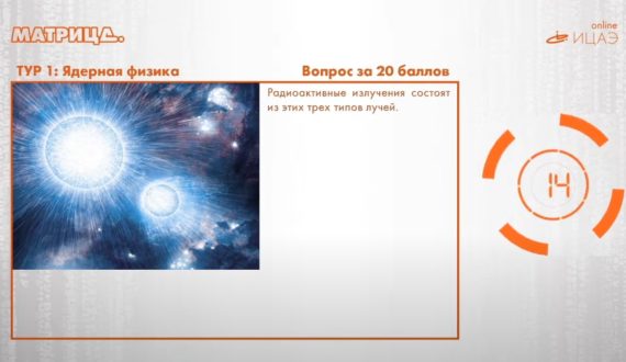 Каждый вопрос был сложнее предыдущего. Игроки должны были ответить, радиоактивность какого элемента открыл Анри Беккерель, какой известный новозеландец предложил ядерную модель атома, чего не содержит изотоп протия и какой газ человек за год потребляет около тонны, а атомные станции не потребляют его совсем.