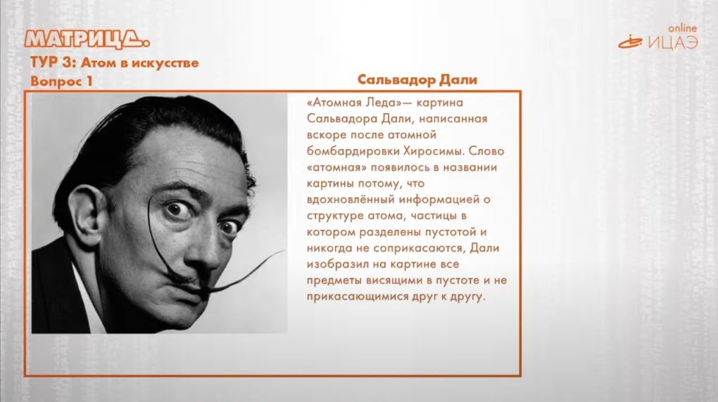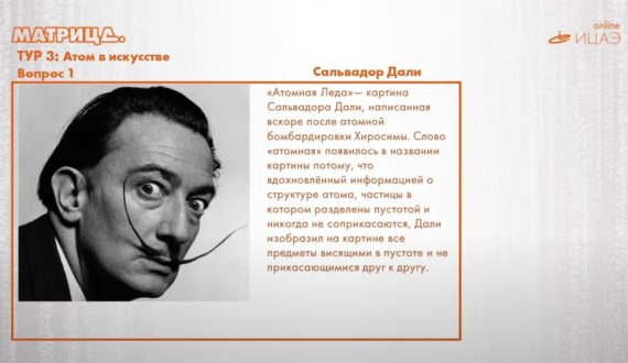 Кисти какого художник принадлежит картина «Атомная Леда», какой период полураспада у цезия-137 и именем какого мифического инженера назван научно-производственный комплекс в Дубне, узнали финалисты ежегодных интеллектуальных игр «Атомные знатоки».
