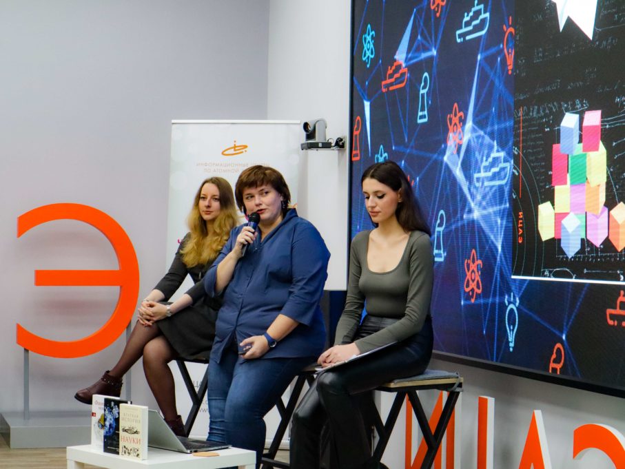Вечер начался с научной гостиной. Гости центра поиграли в любимые настольные игры, почитали журналы «Атомный эксперт» и «Кот Шрёдингера», пообщались с друзьями и попробовали составить вопросы экспертам научно-популярного ток-шоу «Разберём на атомы: модель».