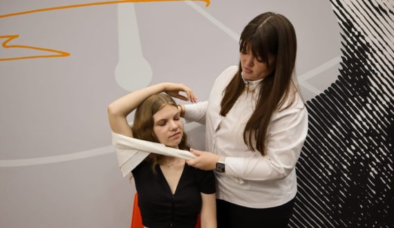 Затем студенты медицинского университета провели мастер-класс по скорой медицинской помощи: познакомили с элементарными приёмами её оказания, сформировали правила поведения, обеспечивающие сохранность жизни и здоровья в современных условиях улицы, природы, быта. Школьники самостоятельно смогли наложить повязки, жгуты, которые применяют при кровотечениях и ожогах.