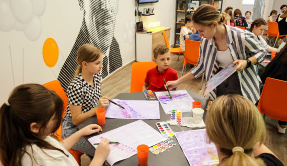 «Техника, в которой мы сегодня будем работать, относится к среднему уровню по сложности. Сочетание мокрой акварели и соли создаёт при высыхании особый эффект на акварельных картинах. Появляются уникальные и красивые текстуры, которые создаются солевыми кристаллами, впитанными в мокрые краски», — начала своё выступление Анастасия Гурьянова, педагог дополнительного образования в школе-интернате для глухонемых детей, создатель студии арт-терапии «Milky Way». Итогом работы стали двадцать уникальных картин, которые гости унесли с собой с мастер-класса.