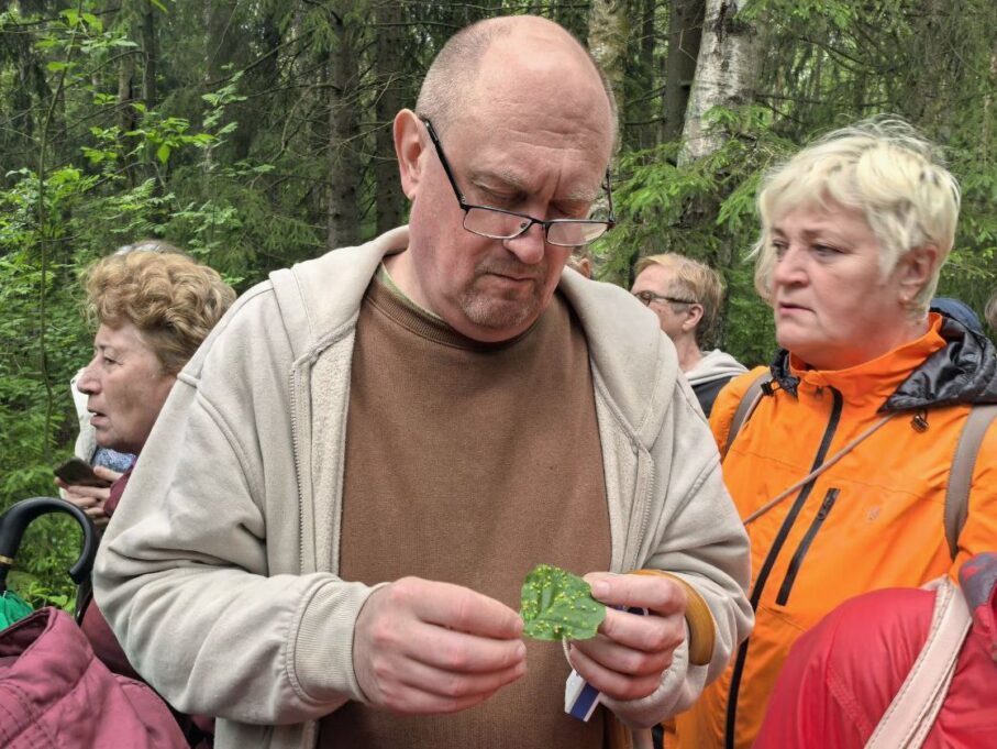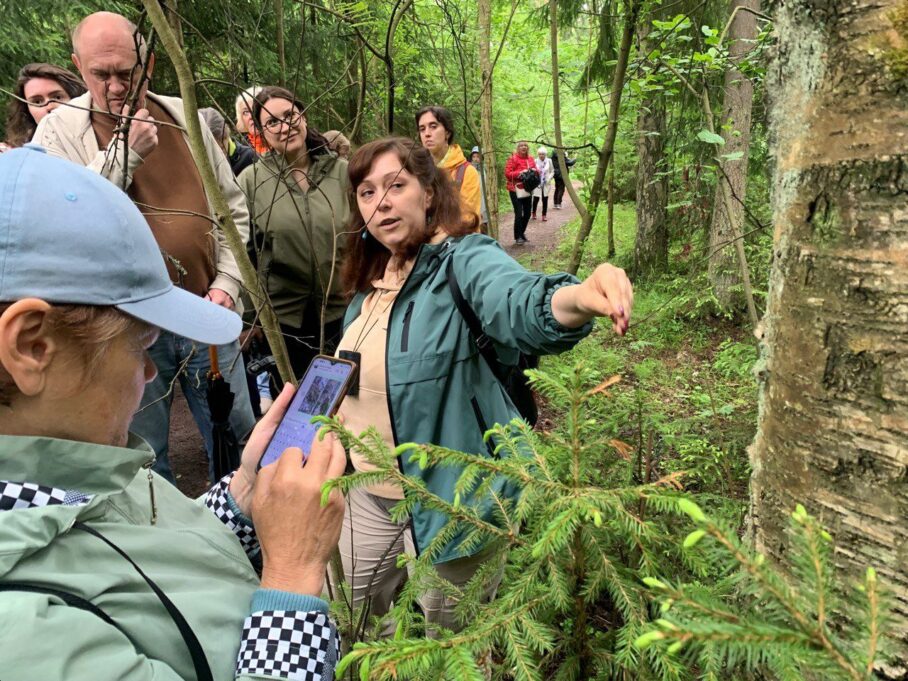 По всему маршруту спикер делала остановки, чтобы обратить внимания на разные особенности. Так гости узнали, что на деревьях, например на берёзах, часто можно встретить зелёную водоросль трентеполию, которая образует на коре порошкообразный налёт кирпично-красного и коричневого цветов. Помимо этого, эксперт показала гостям различные растения, в том числе и ядовитые, а также обратила внимание на трёхсотлетний дуб, растущий на территории заповедника.