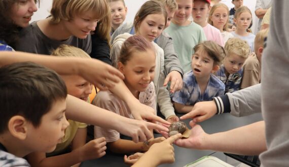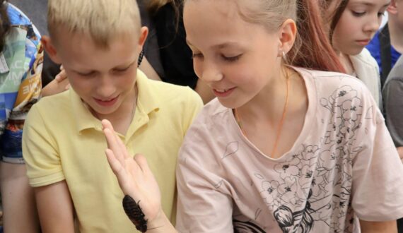 После прямого включения с Санкт-Петербургом участники телемоста в Смоленске познакомились с некоторыми обитателями Смоленского эколого-биологического центра. Методист центра Артём Водопелов рассказал ребятам об экзотических насекомых: мадагаскарских тараканах и палочниках. «В наших широтах такие не водятся, но увидеть их можно в экспозиции центра, некоторых можно даже потрогать. Сегодня, например, дети могут их подержать в руках и убедиться, что они безопасны», — пояснил эксперт. Вместе с насекомыми увидеть можно было и представителей других семейств и видов животных: улитку ахатину, черепаху, хомяков, песчанку и белку дегу.